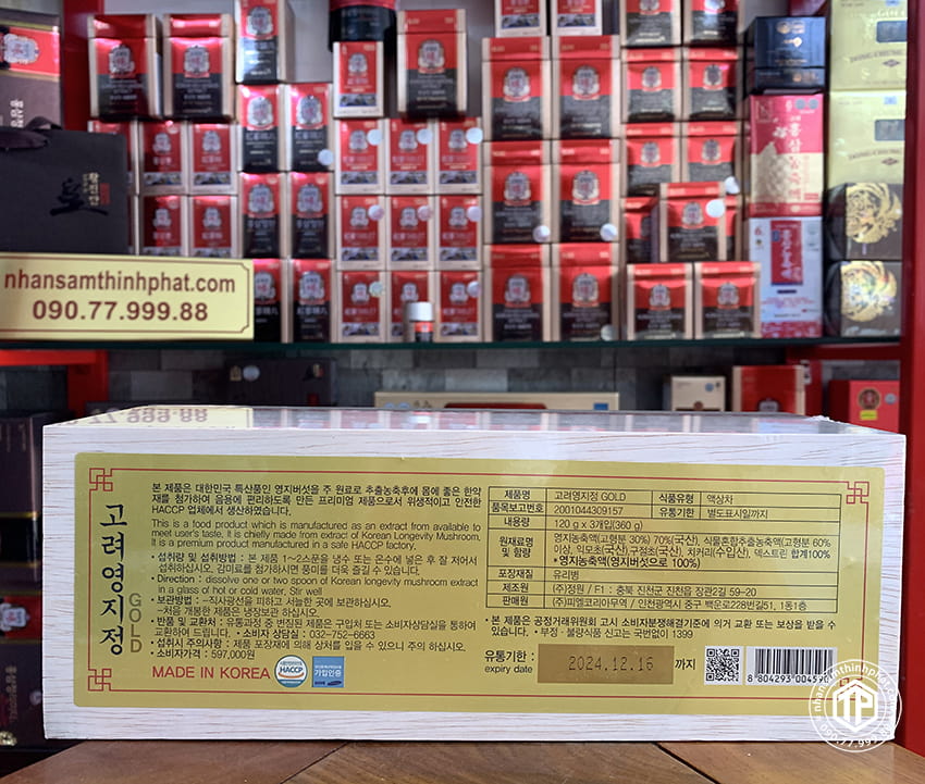 ❂ Trình bày : Cao linh chi Hàn Quốc sao vàng Gold có kiểu dáng sang trọng và bắt mắt có hình dạng hình chữ nhật, bên trong có 3 hộp gỗ con. Mỗi hộp gỗ con chứa 1 lọ cao có dung lượng cao là 120gr. Lọ cao có nắp bảo hiểm. Tổng trọng lượng tịnh là 360gr.