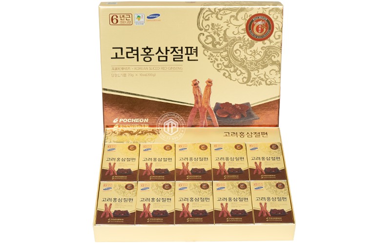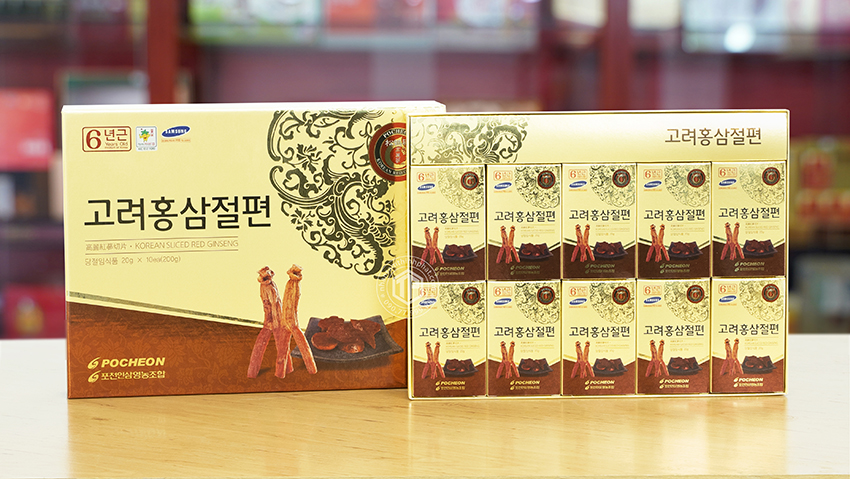 ➢ Hồng sâm Hàn Quốc lát tẩm mật ong Pocheon 200g được làm từ hồng sâm củ nguyên chất xắt lát, sản phẩm được đóng gói 20g/gói và được đóng trong từng hộp nhỏ, rất dễ mang theo và tiện dụng mọi lúc mọi nơi.