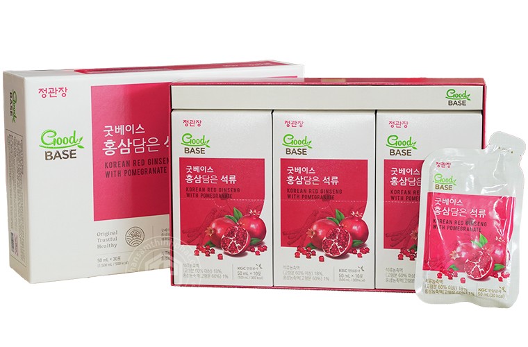 ➢ Nước hồng sâm lựu đỏ Good Base kết hợp lợi ích tự nhiên của hồng sâm Hàn Quốc 6 năm tuổi với hương vị thơm ngon của quả lựu. Lựu chứa nhiều vitamin C, B1, B2, chất chống oxy hóa, kali và polyphenol. Thức uống này được làm từ 100% nguyên liệu tự nhiên và không có hương vị nhân tạo hay chất bảo quản.